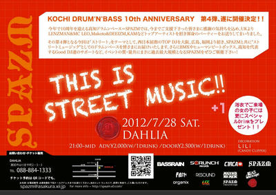 その第4弾となる今回は「ストリート」をテーマとして、西日本屈指のTOP DJを大阪、広島、福岡より招き、SPAZMと共に"ストリートミュージック"としてのドラムンベースを皆さまにお届けいたします。さらにBMXやヒューマンビートボックス、高知を代表するGood DJ達のサポートなど、イベントの質・量共にまさに過去最大規模となるSPAZMをぜひご堪能下さい!