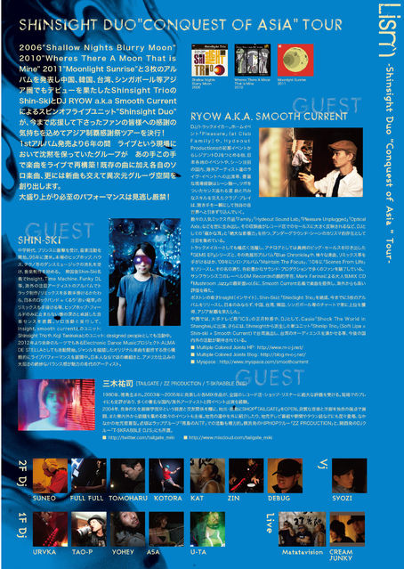 2006"Shallow Nights Blurry Moon" 2010"Wheres There A Moon That is Mine" 2011"Moonlight Sunrise"と3枚のアルバムを発表し中国、韓国、台湾、シンガポール等アジア圏でもデビューを果たしたShinsight TrioのShin-SkiとDJ RYOW a.k.a Smooth Currentによるスピンオフライブユニット"Shinsight Duo" が、今まで応援して下さったファンの皆様への感謝の気持ちを込めて アジア制覇感謝祭ツアーを決行!1stアルバム発売より6年の間 ライブという現場において沈黙を保っていたグループが あの手この手で楽曲をライブで再構築!