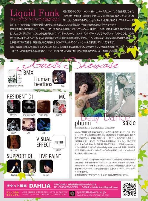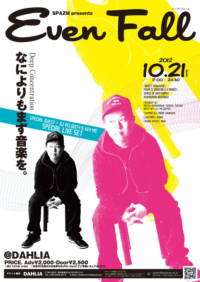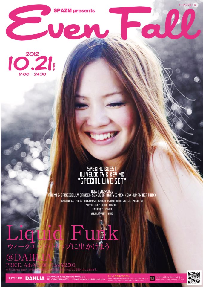 常に高知のクラブシーンにイノベーションをもたらしてきた「SPAZM」が開催10回目を記念して2012年秋にお送りする「EVEN FALL」は、D'N'Bの中でも〈Liquid Funk〉と呼ばれるナイス&スムーズなジャンルを中心に、休日の夕暮れをゆったりと過ごしつつお楽しみいただける新感覚のパーティーです。